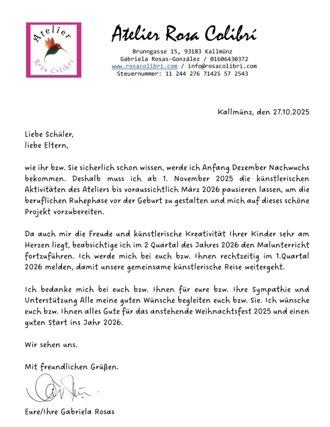 Liebe Freunde, das Atelier Rosa Colibri hat ab dem 1. Dezember 2024 eine neue Adresse: Brunngasse 15, 93183, Kallmünz