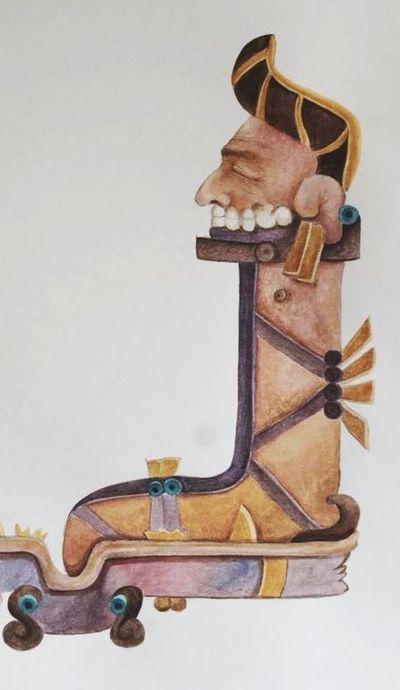 The sun god of the Mayas lies between earth and sky (indicated as a character)
