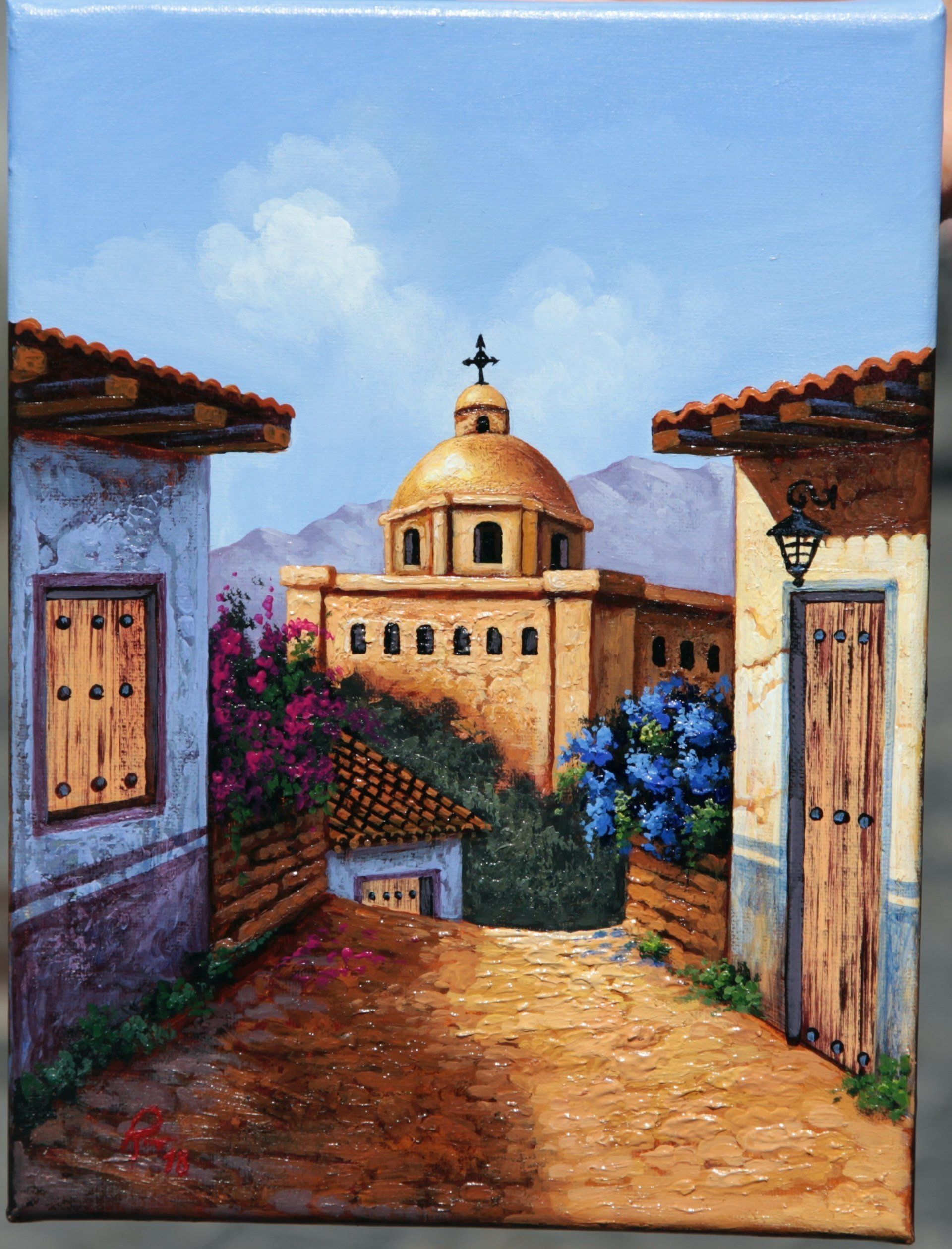 The typical Mexican churches, houses, flowers (Bougainvillea), mountains and other landscapes of Gabriela Rosas shine in a wonderful "Mexican" light. These typified representations may be alike but are always different. One customer placed such a landscape in a dark corridor - and lit it with a spot - now the whole corridor seems brighter and spatially larger.
